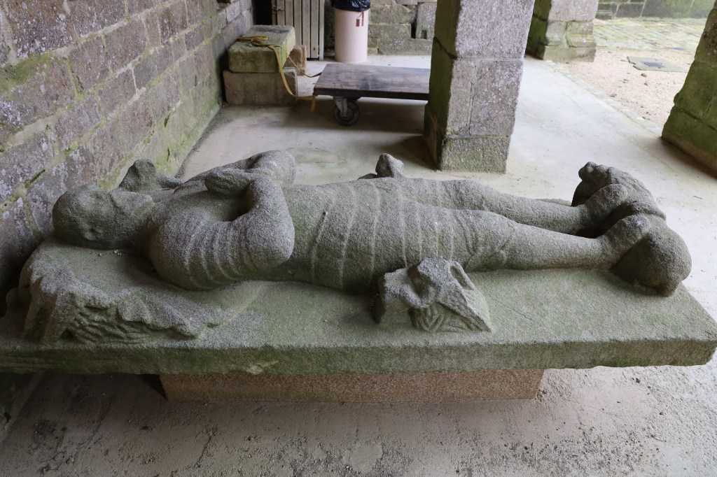 Autour du gisant en granit de Jean Barbier, seigneur de Kerjean, nous sommes accueillis par la directrice, Anne-Flore Marziou, assistée des deux commissaires de l’exposition, Edith Joseph et Sabrina Bisson. Le gros des troupes de l’A.J.P., que Clara Jacquin, chargée des relations presse, est allée chercher à la gare de Brest, nous rejoint peu après. La visite de l’exposition est suivie d’un déjeuner pris dans la grande salle de réunion, avec tous les gestes barrière comme il se doit, puis nous commençons l’exploration du château, guidés par Mme Marziou et par Noémie Cartiaux, chargée de médiation.