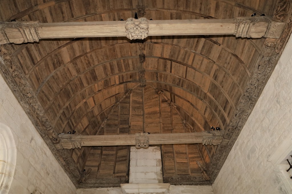 Nous nous attardons dans la chapelle haute qui abrite plusieurs belles statues (un Christ flagellé, un saint Sébastien, deux saint Antoine…) La voûte en berceau, en bois, est remarquable, avec ses deux grandes poutres à engoulant (gueules de dragons). À l’origine, elle était peinte de couleurs chatoyantes. En surplomb des sablières, historiées à la mode bretonne, figurent les 4 évangélistes, reconnaissables aux figures d’animaux ou d’ange qui leur sont associés, et Marie-Madeleine portant un flacon de parfum. Un dispositif ingénieux permet de scruter les sculptures des sablières, dont des grotesques et les armoiries de la famille Barbier. En hauteur, une large fenêtre grillagée (qui ne donne plus sur aucune pièce à présent) permettait à la famille seigneuriale de suivre la messe sans se mêler au peuple.