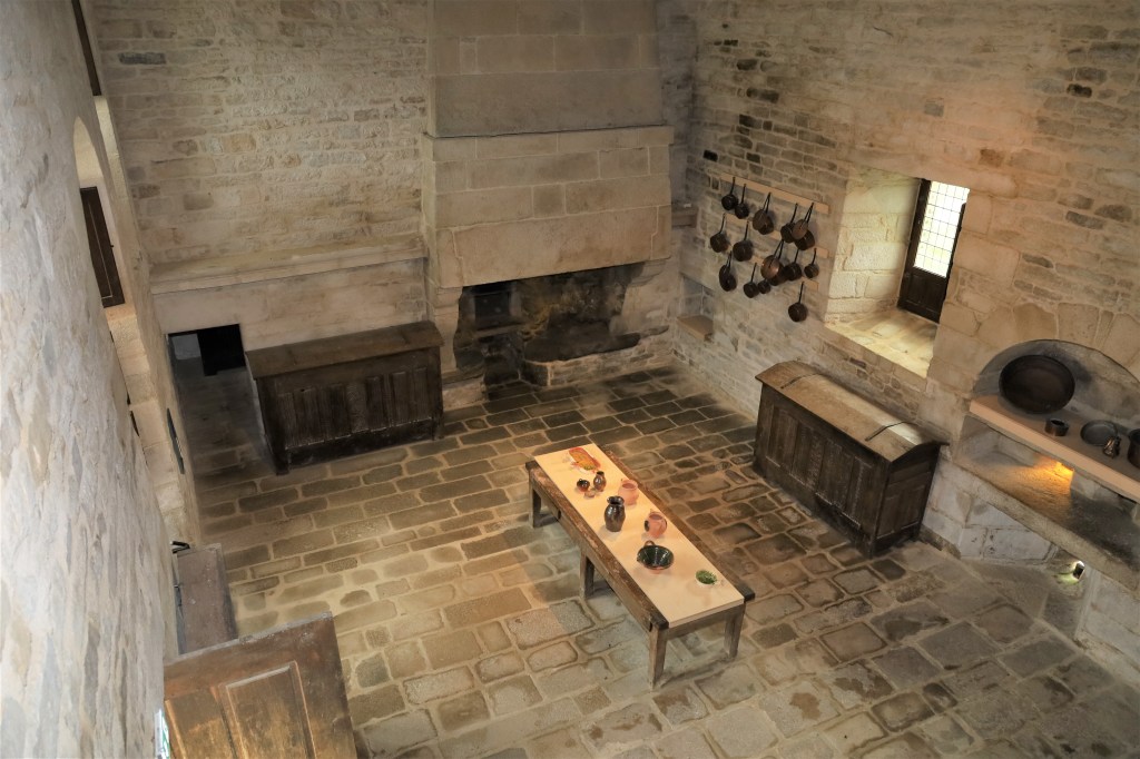 Au rez-de-chaussée de l’aile droite, une magnifique cuisine à deux cheminées servait à la confection des repas du personnel. Elle est ornée de casseroles en cuivre et de poteries. Un dispositif ingénieux au bas du mur permettait d’évacuer les eaux usées. Par une fenêtre percée dans la paroi, l’intendant, dont le bureau était contigu, pouvait surveiller les cuisiniers et les marmitons.