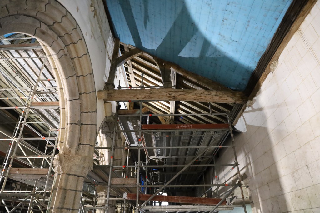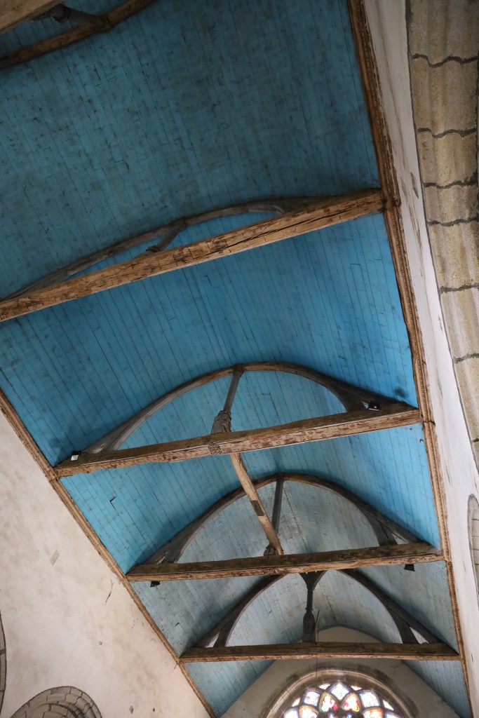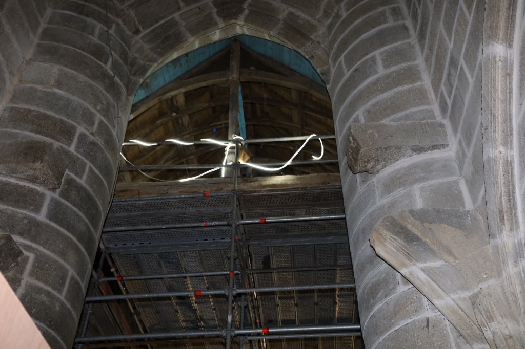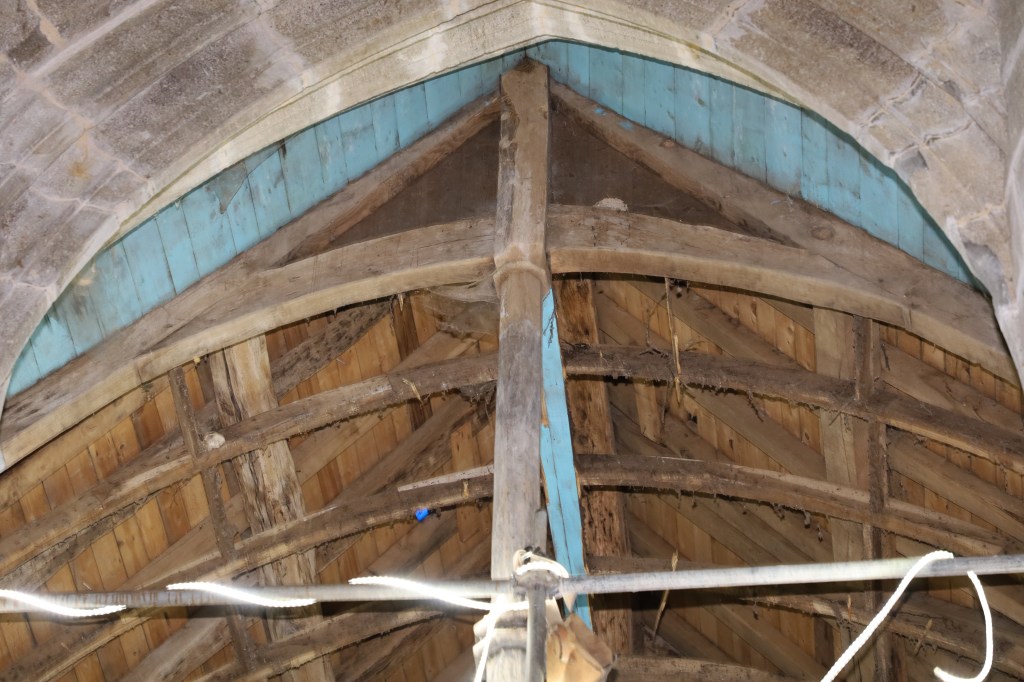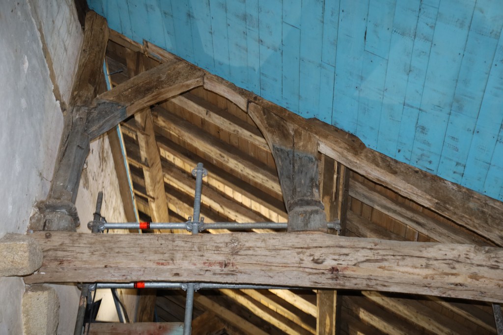 En décembre 2024, les compagnons charpentiers de la société Cruard ont été chargés de déposer la voûte en bois azurée de la chapelle afin de découvrir la structure de la charpente. Il s’agit, dans un premier temps, de poser un diagnostic sur l’état de cette charpente. De ce diagnostic dépendront les décisions qui seront prises pour sa réfection, et la pose éventuelle d’une nouvelle voûte au-dessus de la nef et des chapelles latérales de Saint-Herbot.