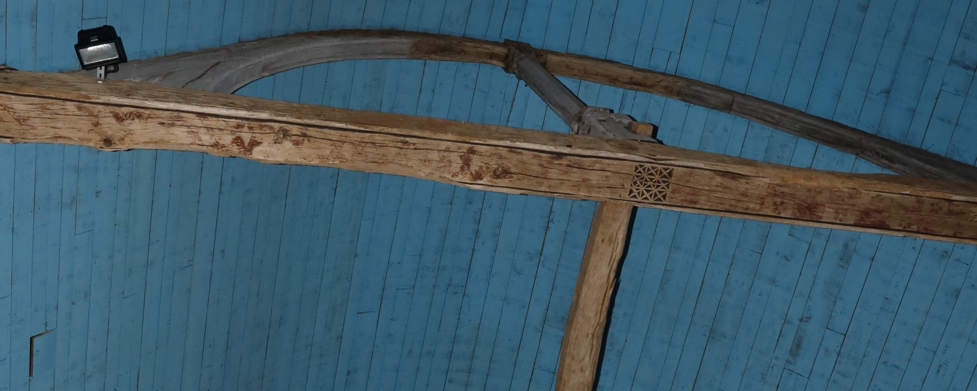 En effet, les bois de charpente sont ornés de fins décors colorés que le temps a en grande partie effacés. Le restaurateur commence par retrouver les couleurs sous la couche de poussière et les étiqueter en vue d’une restauration ultérieure.