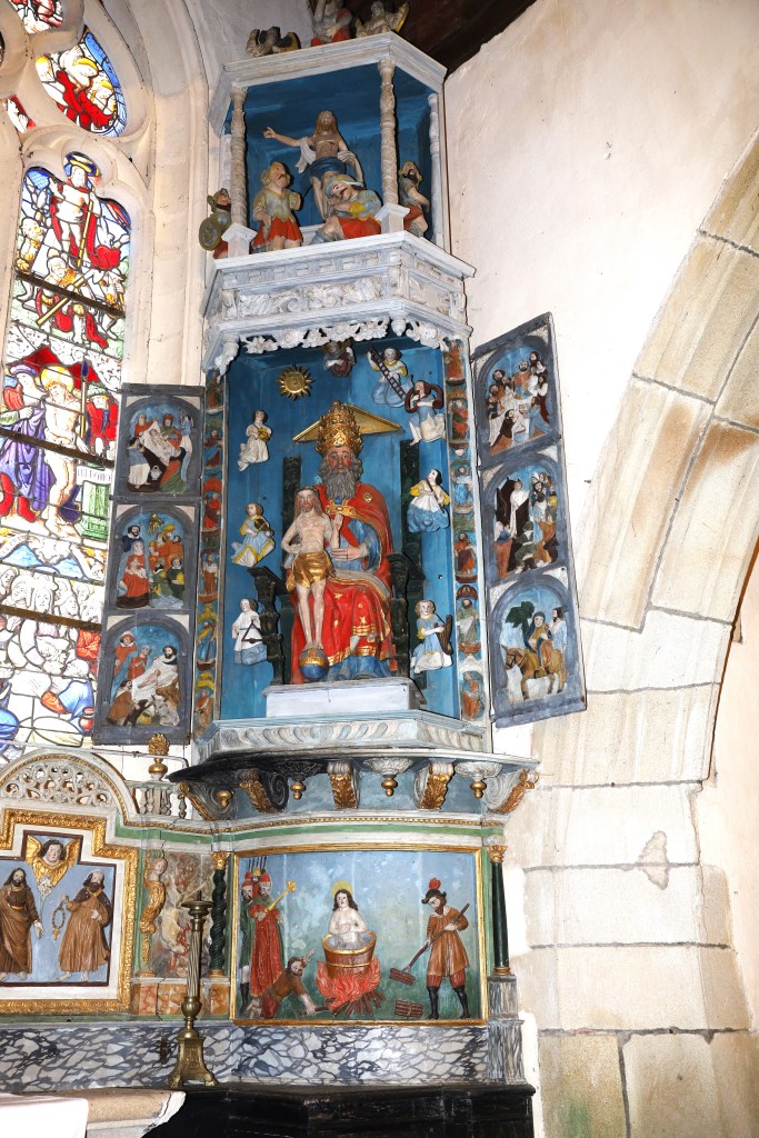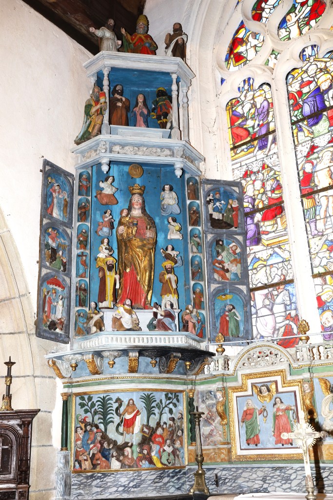 Dans le chœur, deux retables à trois étages en bois polychrome, datés de la deuxième moitié du XVIe siècle, encadrent le maître-autel : Notre Dame à gauche, la Sainte Trinité à droite (la fête de la Trinité est le jour du grand pardon de la chapelle).