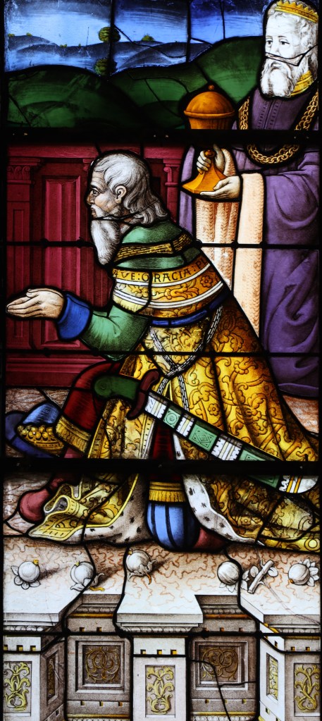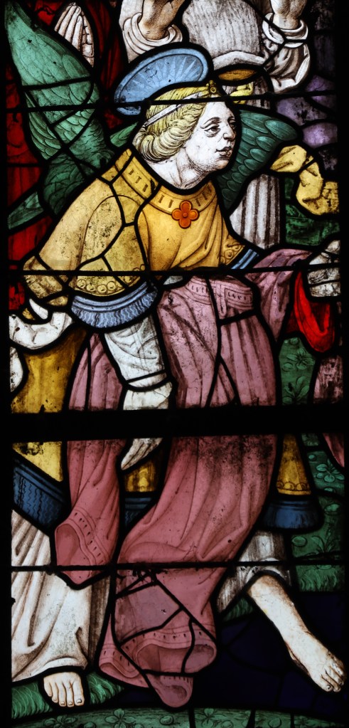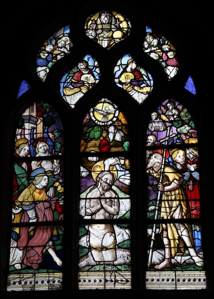 Transept nord : le vitrail de la Nativité (1546, restauré en 2022 par les maîtres-verriers Claire Babet et Emma Groult) se présente en deux parties : en haut, l’adoration des bergers ; en bas, l’adoration des rois mages.