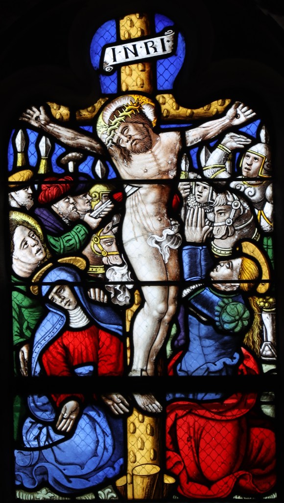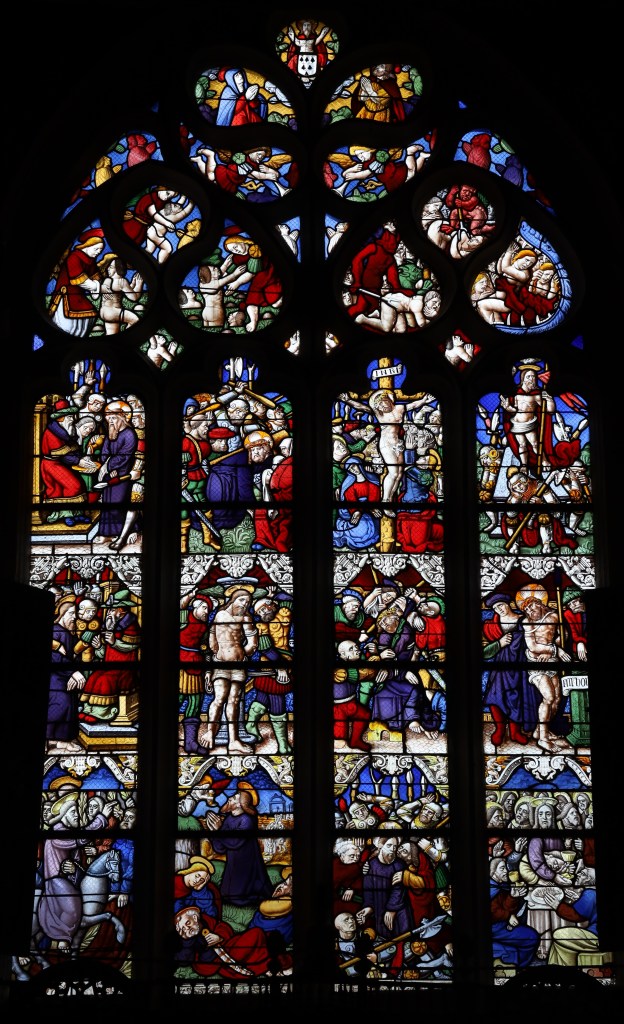 Maîtresse vitre : le vitrail de la Passion (avant 1573, restauré par l’atelier Le Bihan de Quimper). La lecture se fait de bas en haut et de gauche à droite, de l’entrée de Jésus à Jérusalem jusqu’à sa résurrection.