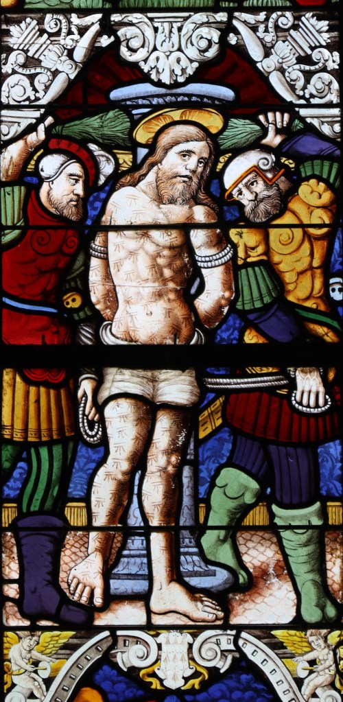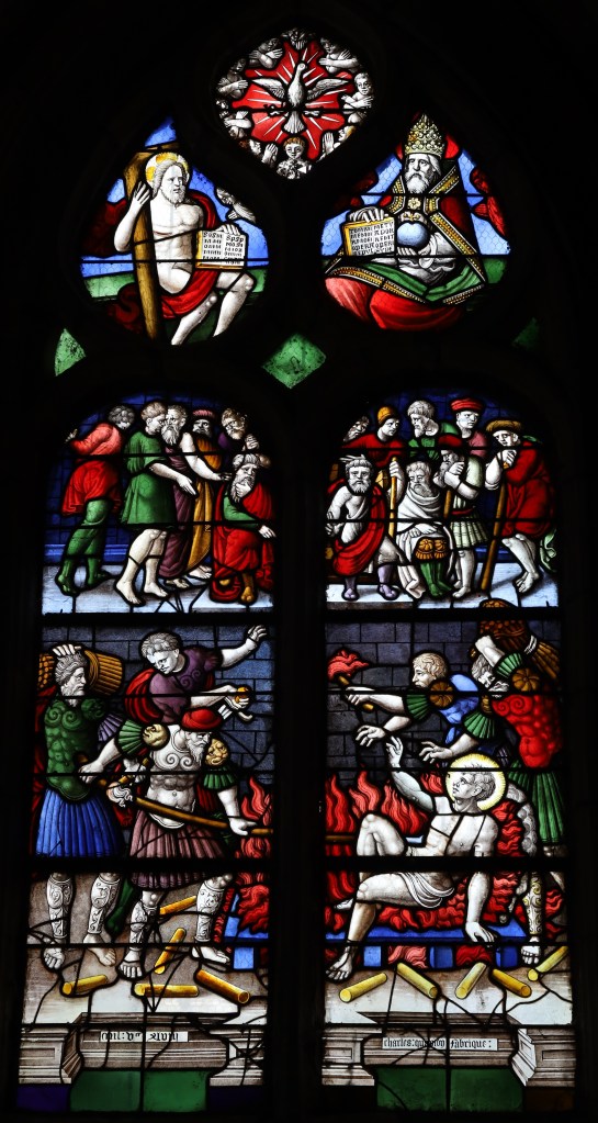 Bras nord : le vitrail de saint Laurent (1548). Le saint est représenté sur le gril de son martyr.