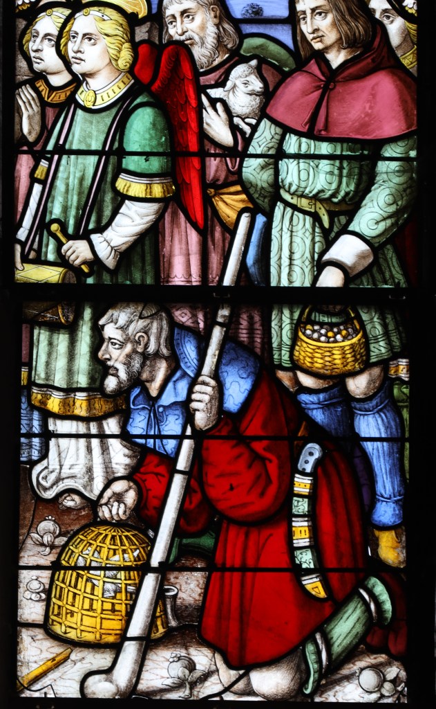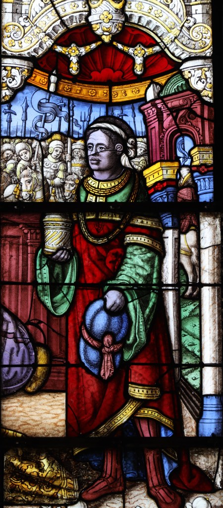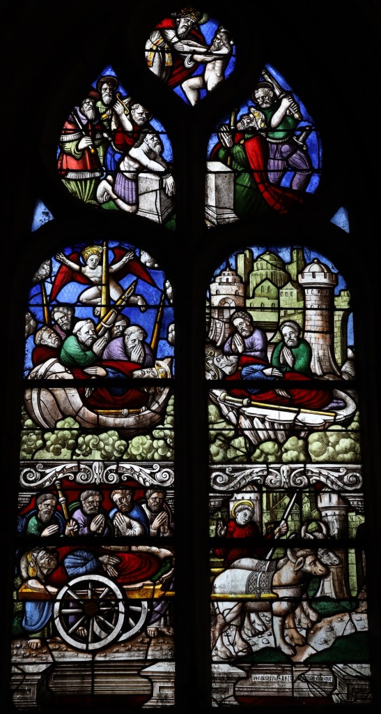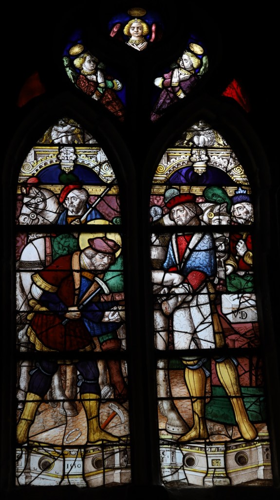 Bas-côté sud : le vitrail de saint Eloi (1550) : selon la légende, le saint ferre un cheval dont il a coupé le pied.