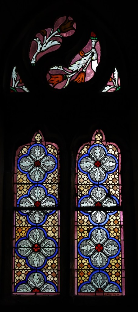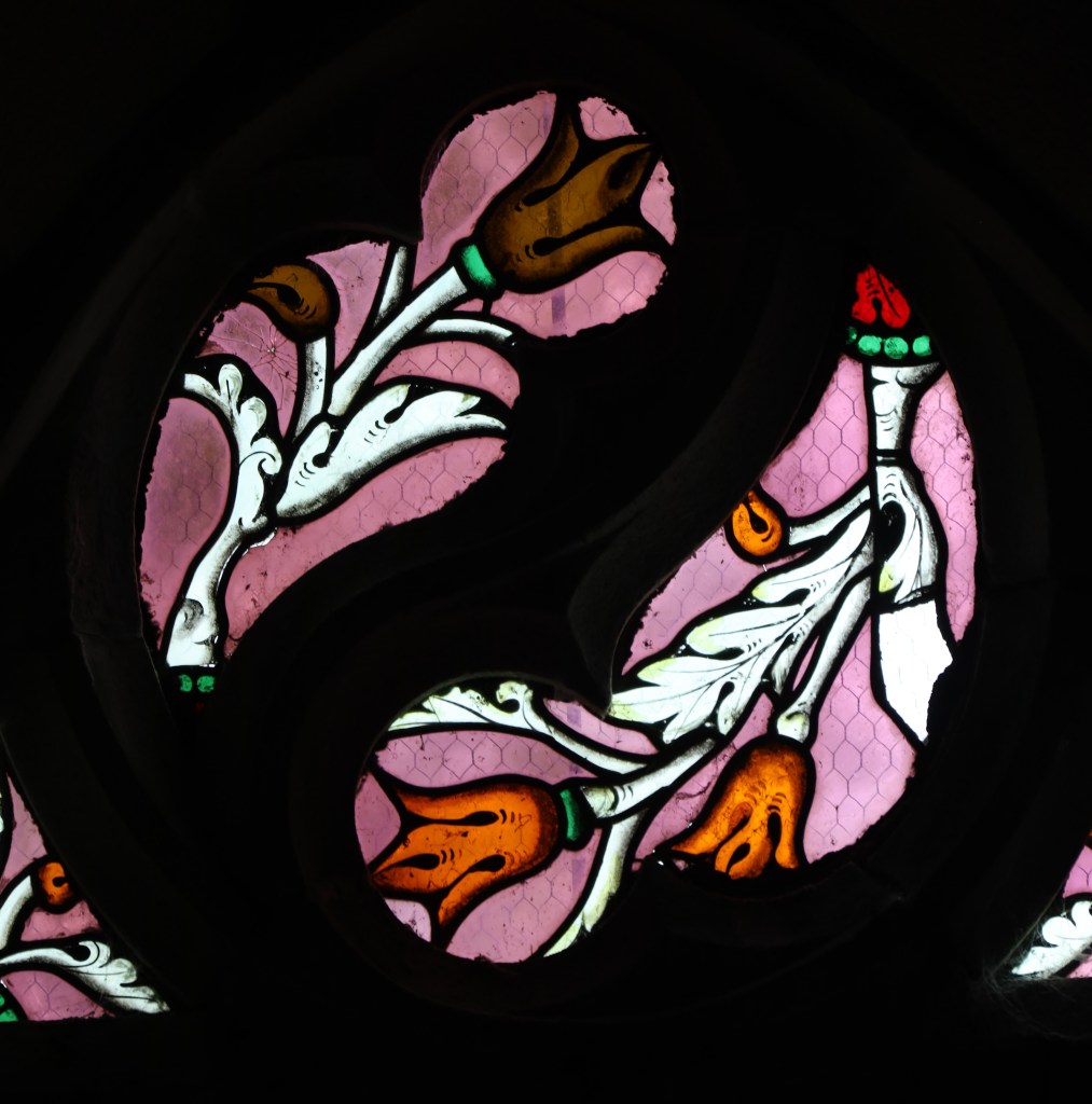 Enfin, dans le bas-côté nord, le vitrail art nouveau composé de motifs floraux a été créé en 1912 par l’artiste et maître-verrier bretonne Anna Saluden.