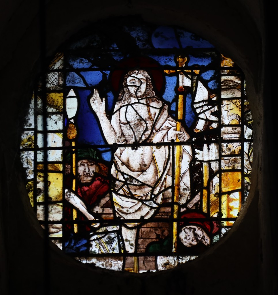 Dans l’oculus au-dessus de la porte principale, à l’ouest, le vitrail de la Résurrection est un remploi d’un vitrail du XVe siècle, appartenant sans doute à une chapelle disparue, remonté par l’atelier Albert Bonnot de Paris vers 1912.