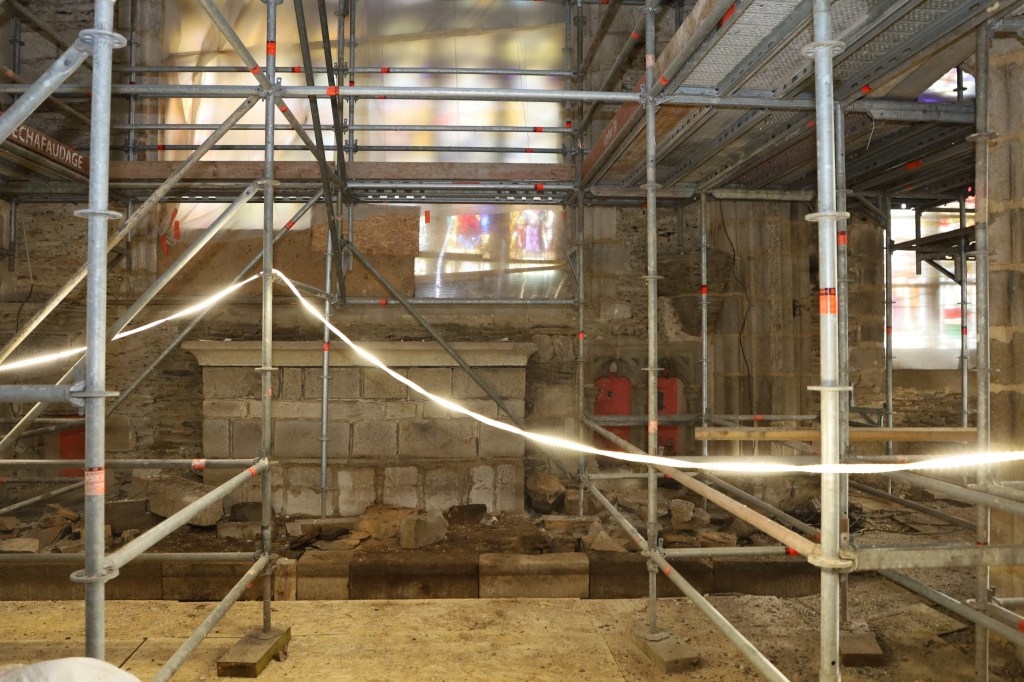 Les travaux continuent à l’intérieur de la nef, comme le montre la véritable forêt d’échafaudages.