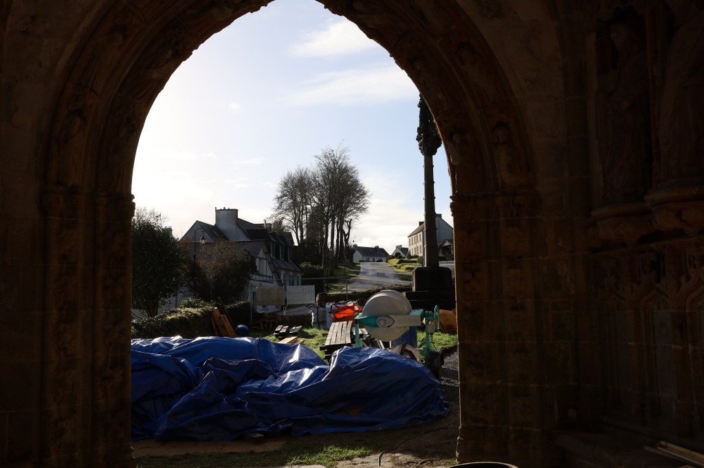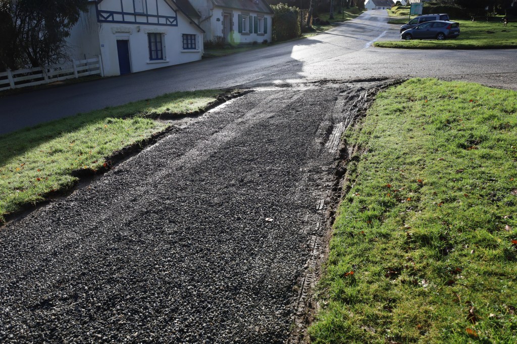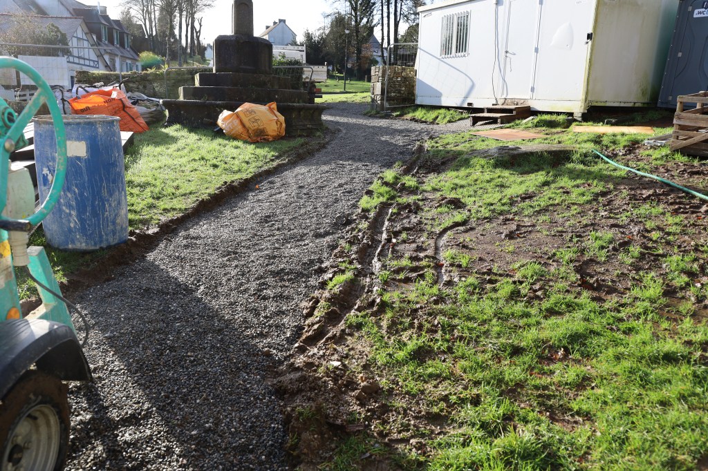 Le chemin qui mène au placître avait subi des détériorations dues aux intempéries : les employés de la voirie de Plonévez-du-Faou sont venus épandre un tombereau de graviers pour que les entreprises puissent garer leurs véhicules de chantier au plus près.